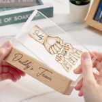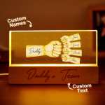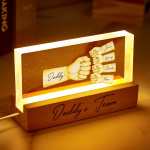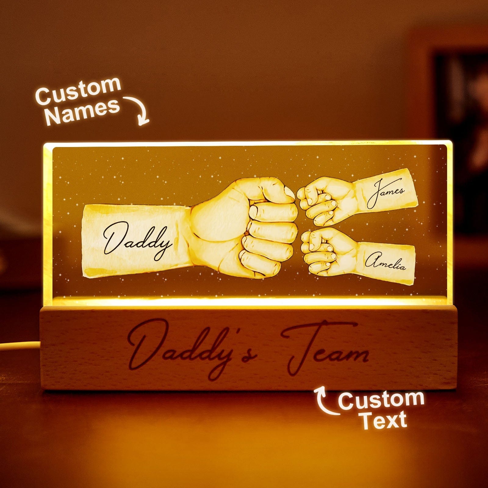 • Hecha de acrílico de alta calidad, esta luz nocturna LED presenta una conmovedora ilustración de un golpe de puño, que simboliza el fuerte vínculo entre papá y su equipo. El diseño personalizable te permite agregar los nombres de los pequeños miembros del equipo de papá, lo que la convierte en un regalo verdaderamente especial y único.
