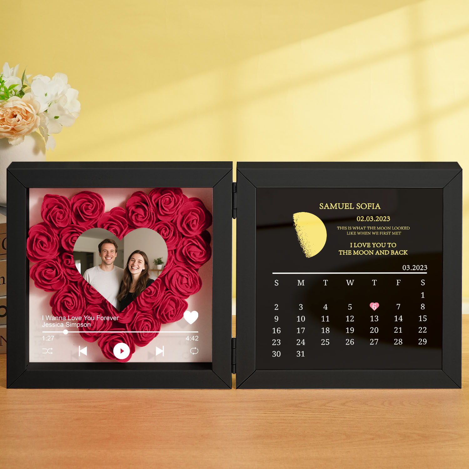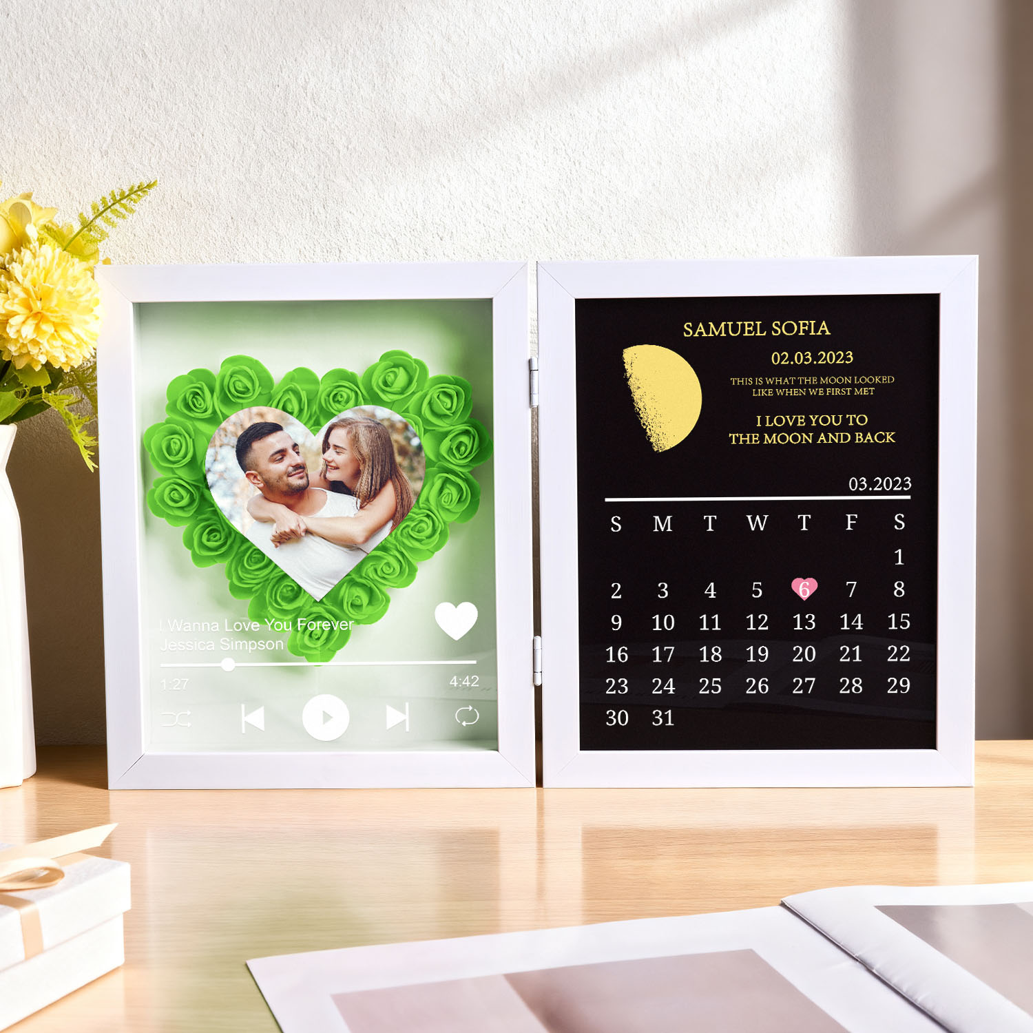 ? Caja de Sombras Personalizada con Flores Musicales - ¡Con Fase Lunar Real y una Canción de Amor! ??
