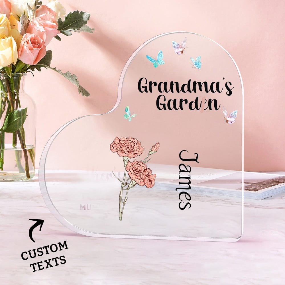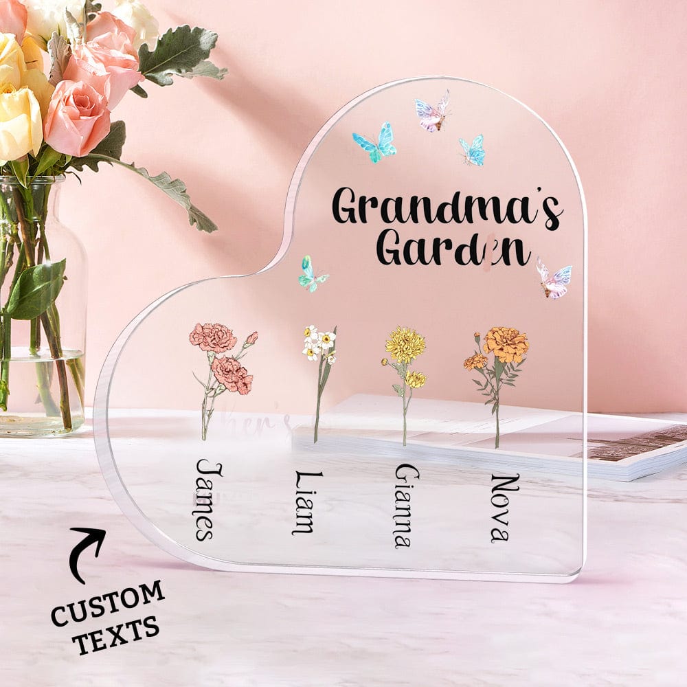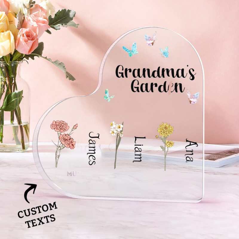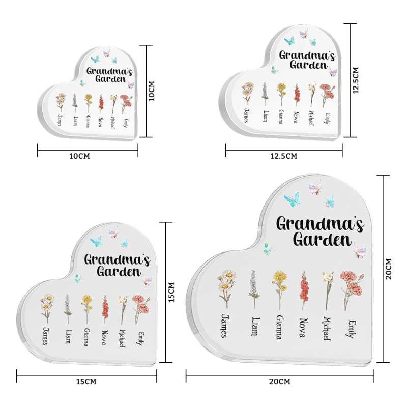Cada letrero acrílico se puede personalizar con uno a seis nombres a tu elección, convirtiéndolo en un detalle verdaderamente único y especial para el jardín de la abuela. La forma de corazón simboliza el amor y la alegría que comparten los miembros de la familia.
