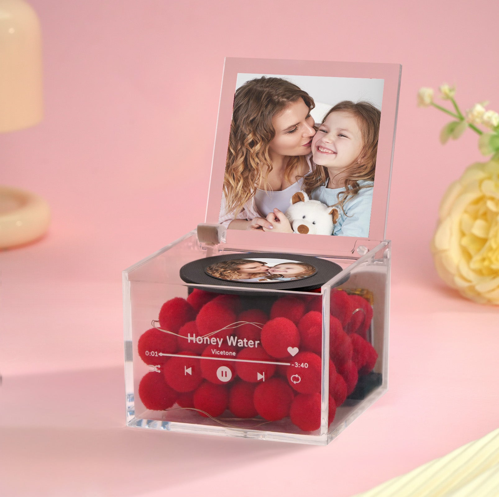 Aporte un toque de nostalgia y personalización a su espacio con este Mini tocadiscos personalizado con foto y luz, caja de música personalizada. Diseñada para parecerse a un tocadiscos antiguo, esta caja de música es más que una pieza decorativa: es un recuerdo entrañable que combina tus recuerdos más preciados con melodías relajantes.Características principales:Disco de fotos personalizable: Personaliza el minidisco de vinilo con la foto que elijas, convirtiéndolo en un regalo significativo o un complemento especial para la decoración de tu hogar.Luz suave integrada: La luz integrada añade un brillo cálido y ambiental, creando una atmósfera acogedora mientras disfrutas de la música.Mecanismo de caja de música de alta calidad: Reproduce una hermosa melodía con una precisión artesanal excepcional, evocando dulces emociones cada vez que le das cuerda.Diseño de tocadiscos antiguo: Un diseño compacto de inspiración retro que captura el encanto de un tocadiscos clásico. Perfecto para amantes de la música y entusiastas de lo vintage.