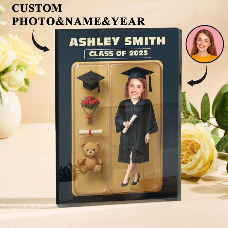 Eleva la experiencia de regalar con nuestro Pack de Figuras de Acción con Efecto 3D personalizado. Esta placa acrílica personalizada es un regalo original y especial para una graduación, con un llamativo efecto 3D que captura a la perfección su dedicación.