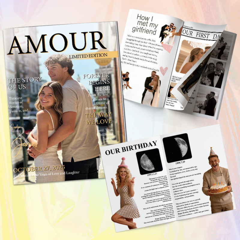 Deposita tu amor en Revista personalizada para parejas - un recuerdo único diseñado para celebrar tu historia de amor de la manera más creativa. Cada página está diseñada con tus fotos, nombres, fechas significativas y momentos especiales, transformándolos en un elegante diseño estilo revista que resulta divertido y conmovedor.