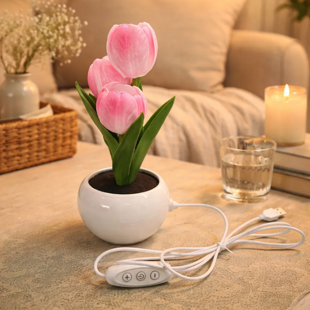 ✨ Elegante resplandor románticoEsta luz nocturna LED con forma de tulipán crea una atmósfera suave y cálida, perfecta para dormitorios, mesitas de noche, salas de estar o rincones acogedores.