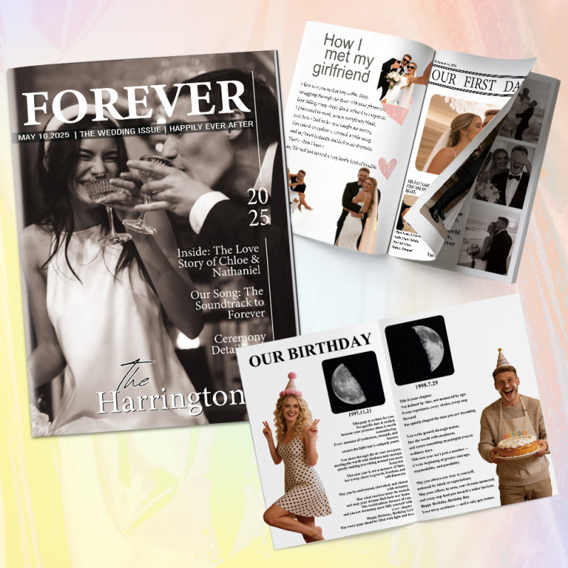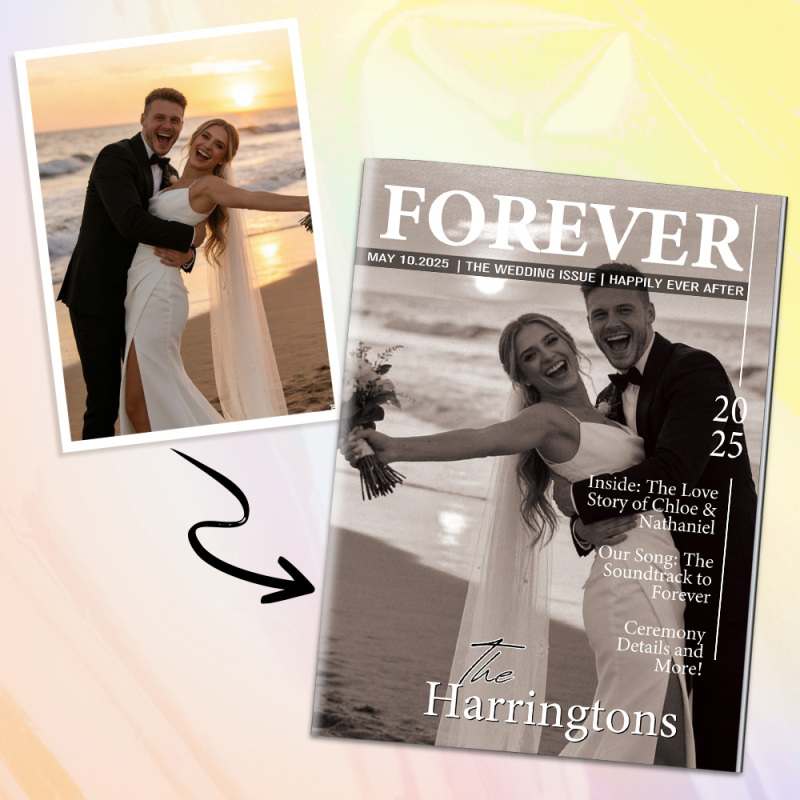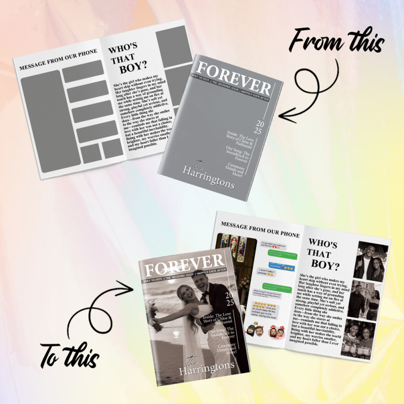 Deposita tu amor en Revista de boda personalizada - un recuerdo único diseñado para celebrar tu historia de amor de la manera más creativa. Cada página está diseñada con tus fotos, nombres, fechas significativas y momentos especiales, transformándolos en un elegante diseño estilo revista que resulta divertido y conmovedor.