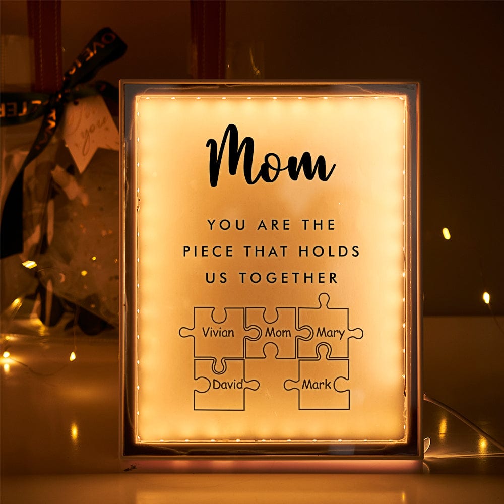 Para el romance y el cariño de esta vida, necesitas dejar una copia de tu madre. Con motivo del Día de la Madre, envía a mamá una luz nocturna con un letrero de rompecabezas con los nombres de los niños. Y proclama con orgullo a mamá 'Eres la pieza que nos mantiene unidos'. Este regalo conmoverá a tu madre o esposa más que cualquier promesa y la hará feliz como a una niña.