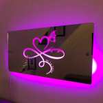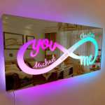 Este elegante espejo personalizado con nombre e iluminación LED es un complemento perfecto y único para la habitación de tu pareja. Le encantará iluminar el espejo y ver su nombre reflejado. Este llamativo espejo personalizado es el regalo perfecto y será apreciado durante muchos años. Incluye control remoto para la iluminación LED y soportes cromados para montaje en pared.