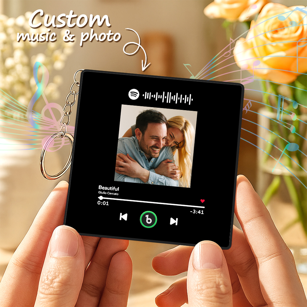Perfecto para aniversarios, cumpleaños o simplemente porque sí, este bonito recuerdo combina una foto entrañable con el poder de la música, creando momentos emotivos que perduran.