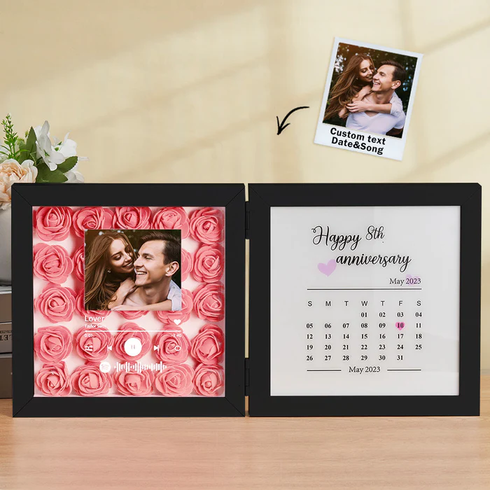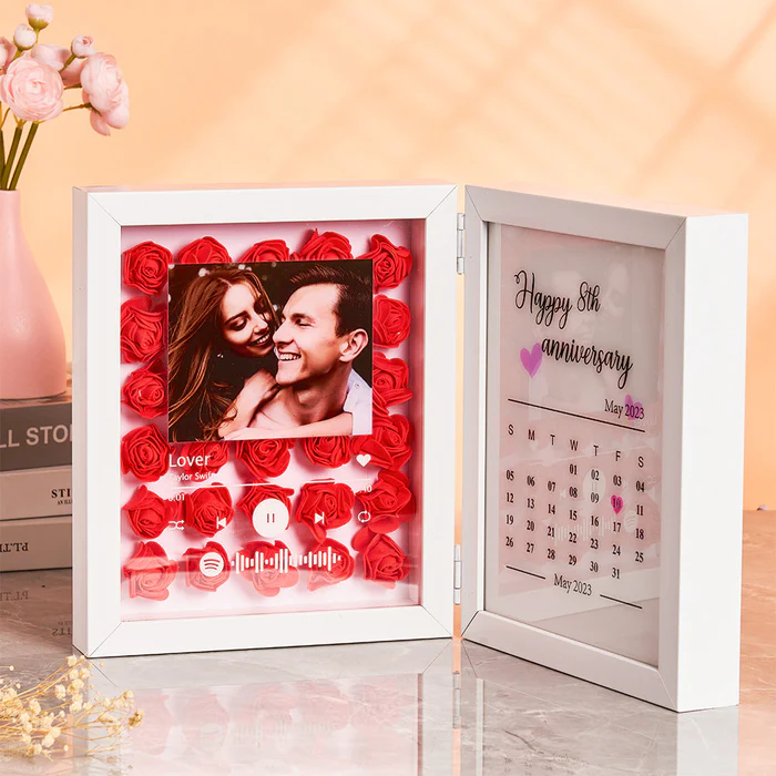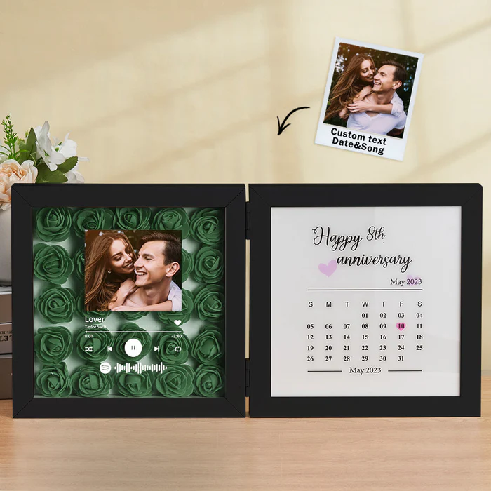 Presentamos nuestra Caja de Sombras Personalizada con Música y Calendario de Aniversario: una fusión impresionante de arte floral hecho a mano, personalización romántica y una melodía a medida. Este marco único te permite conmemorar tu primer beso, propuesta de matrimonio, boda o cualquier momento inolvidable, junto con una canción que cuente tu historia.