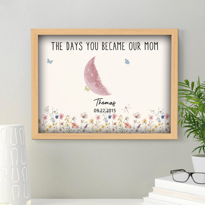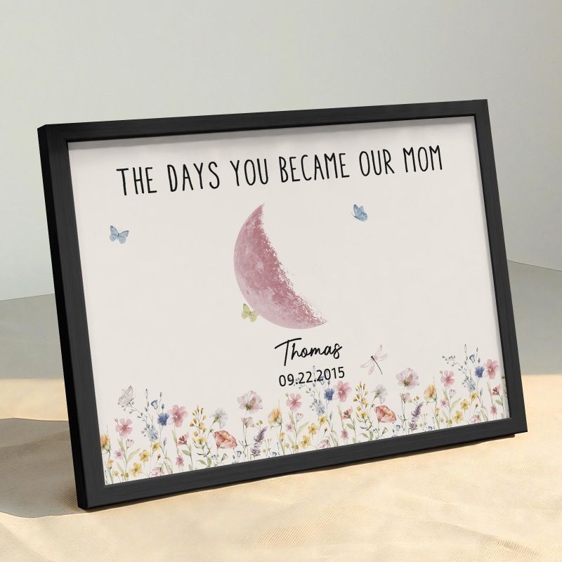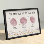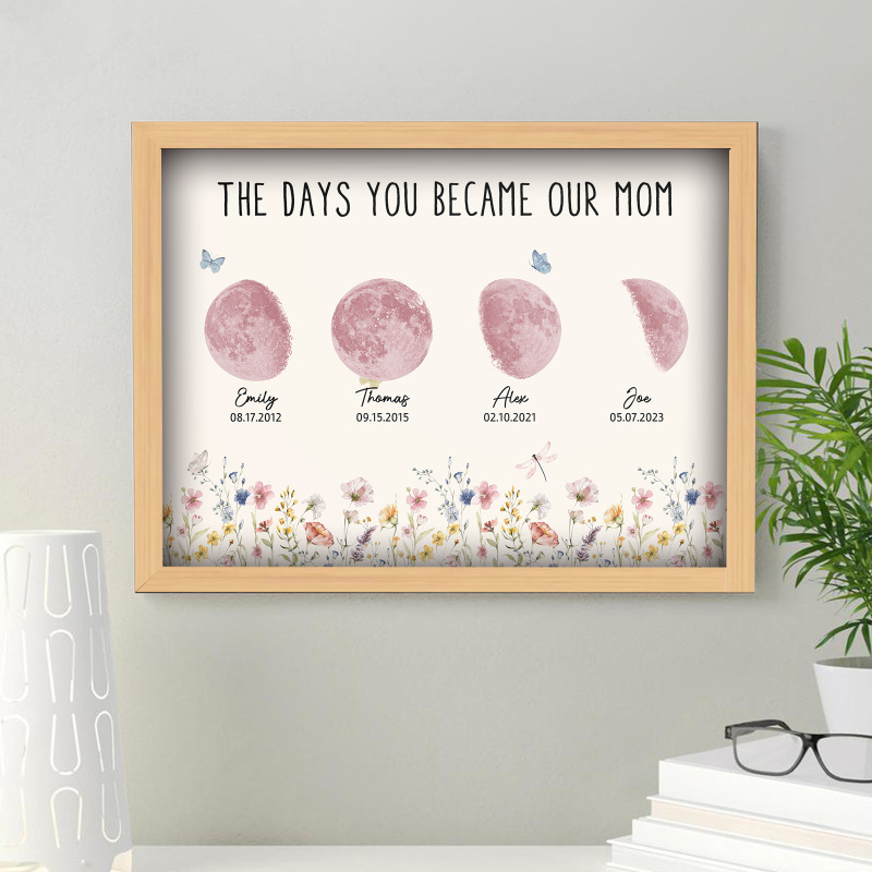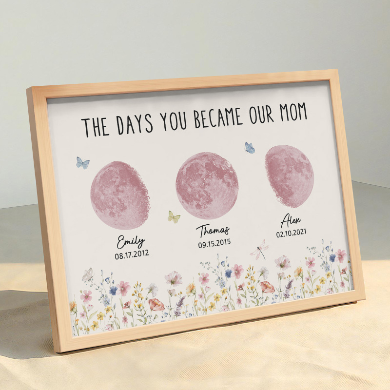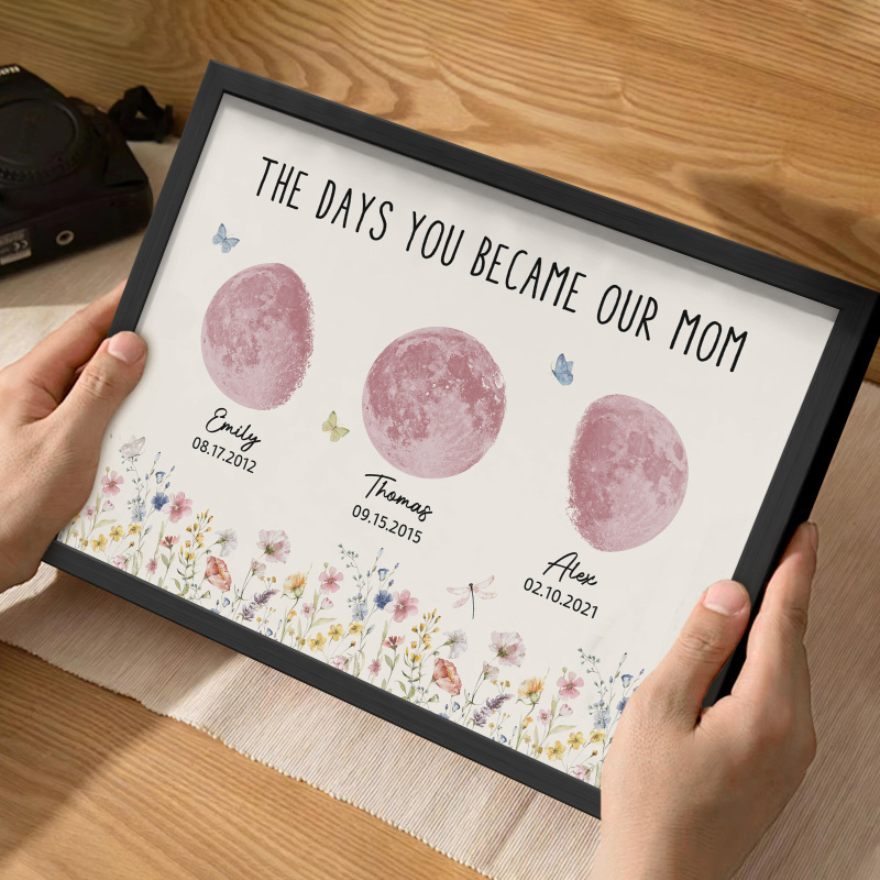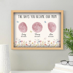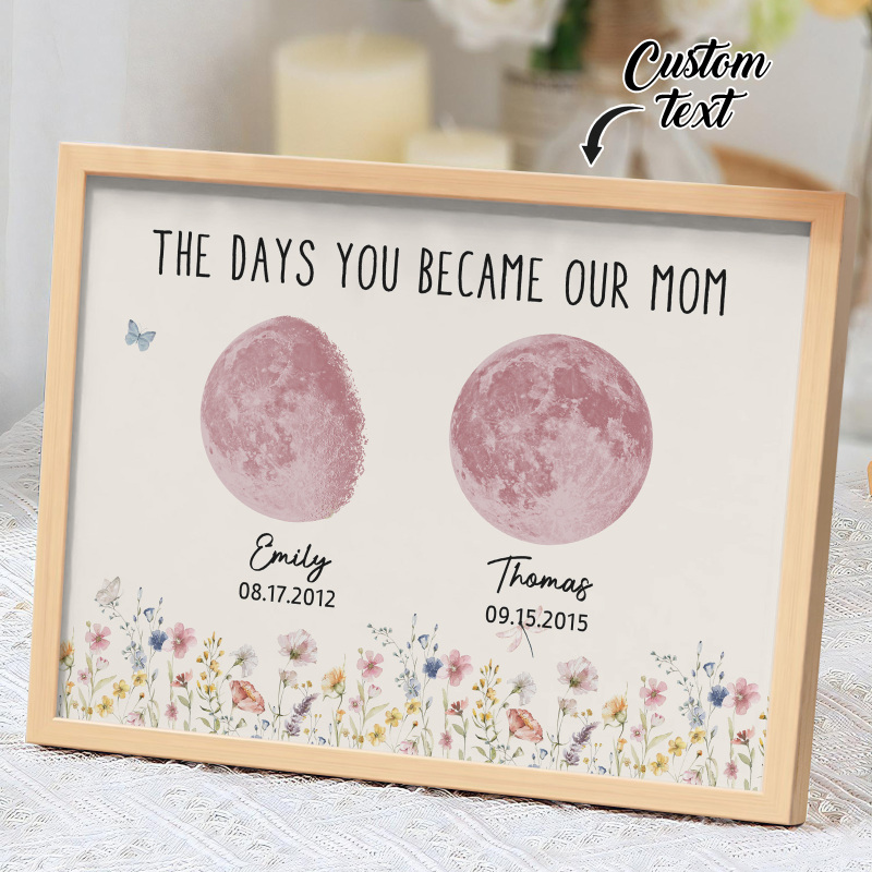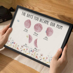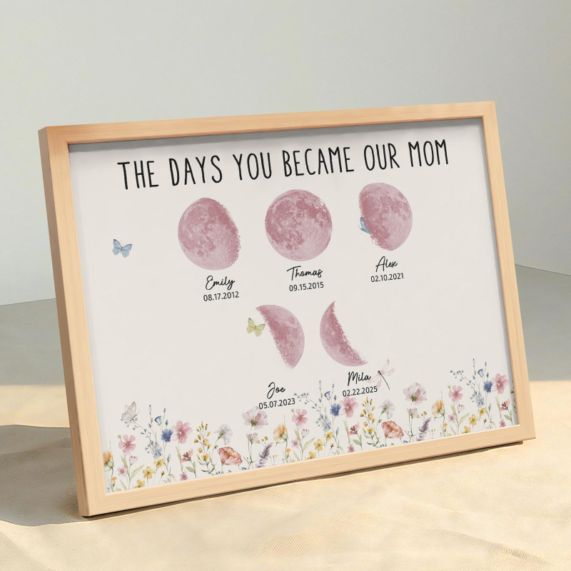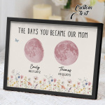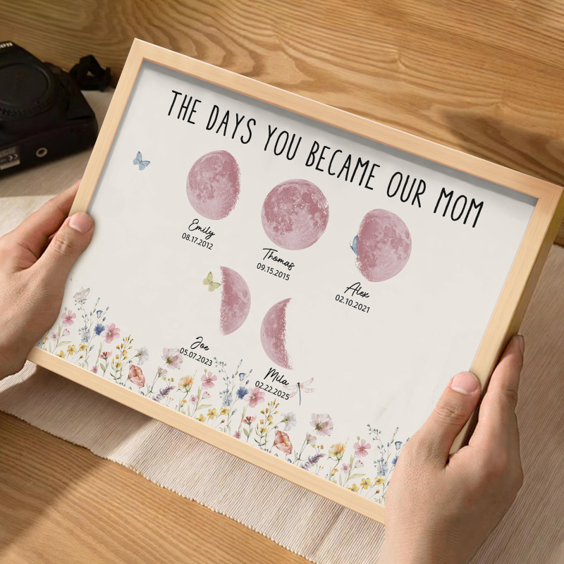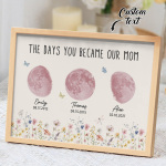 El nombre, la fecha de nacimiento y la fase lunar única de cada niño se muestran de forma hermosa, creando un recuerdo celestial único que honra los momentos especiales que la convirtieron en madre.