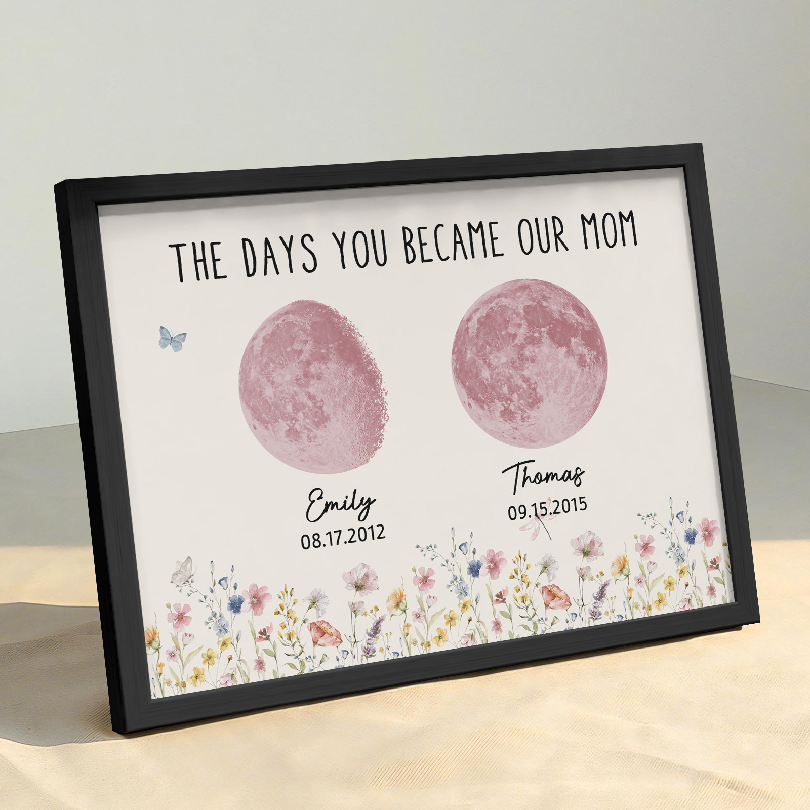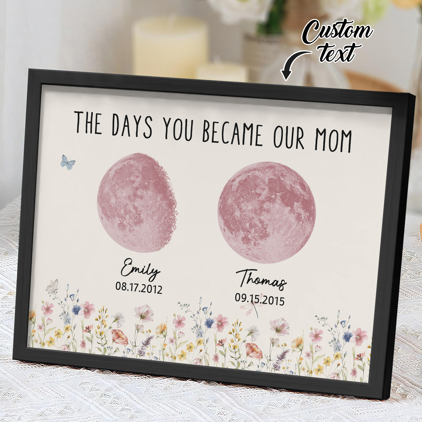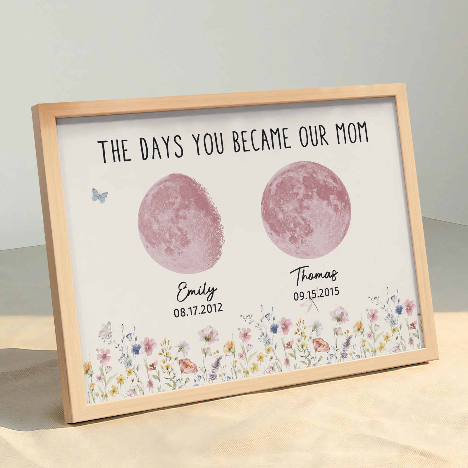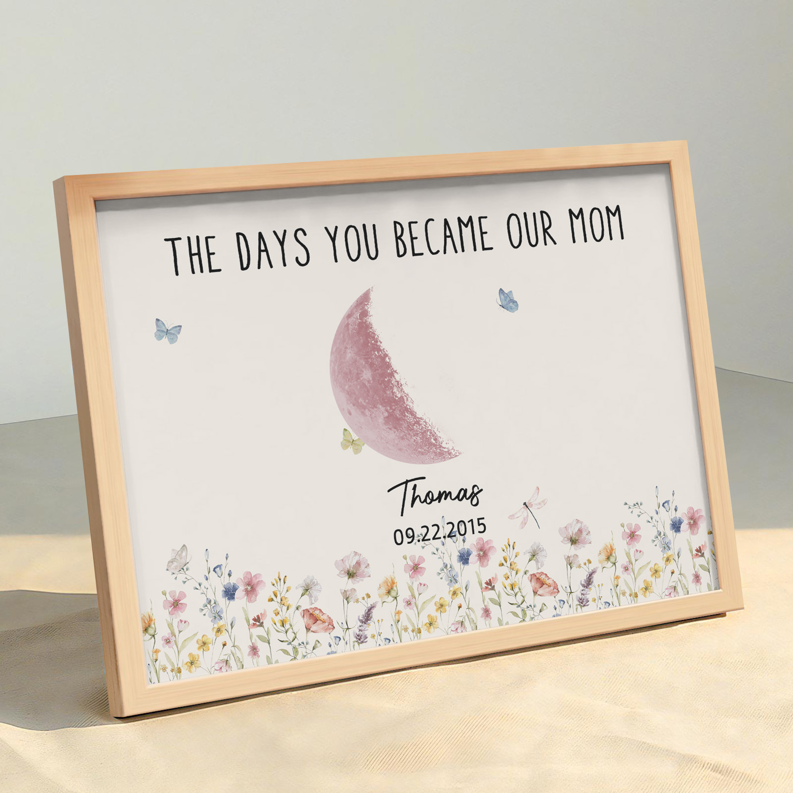 El nombre, la fecha de nacimiento y la fase lunar única de cada niño se muestran de forma hermosa, creando un recuerdo celestial único que honra los momentos especiales que la convirtieron en madre.