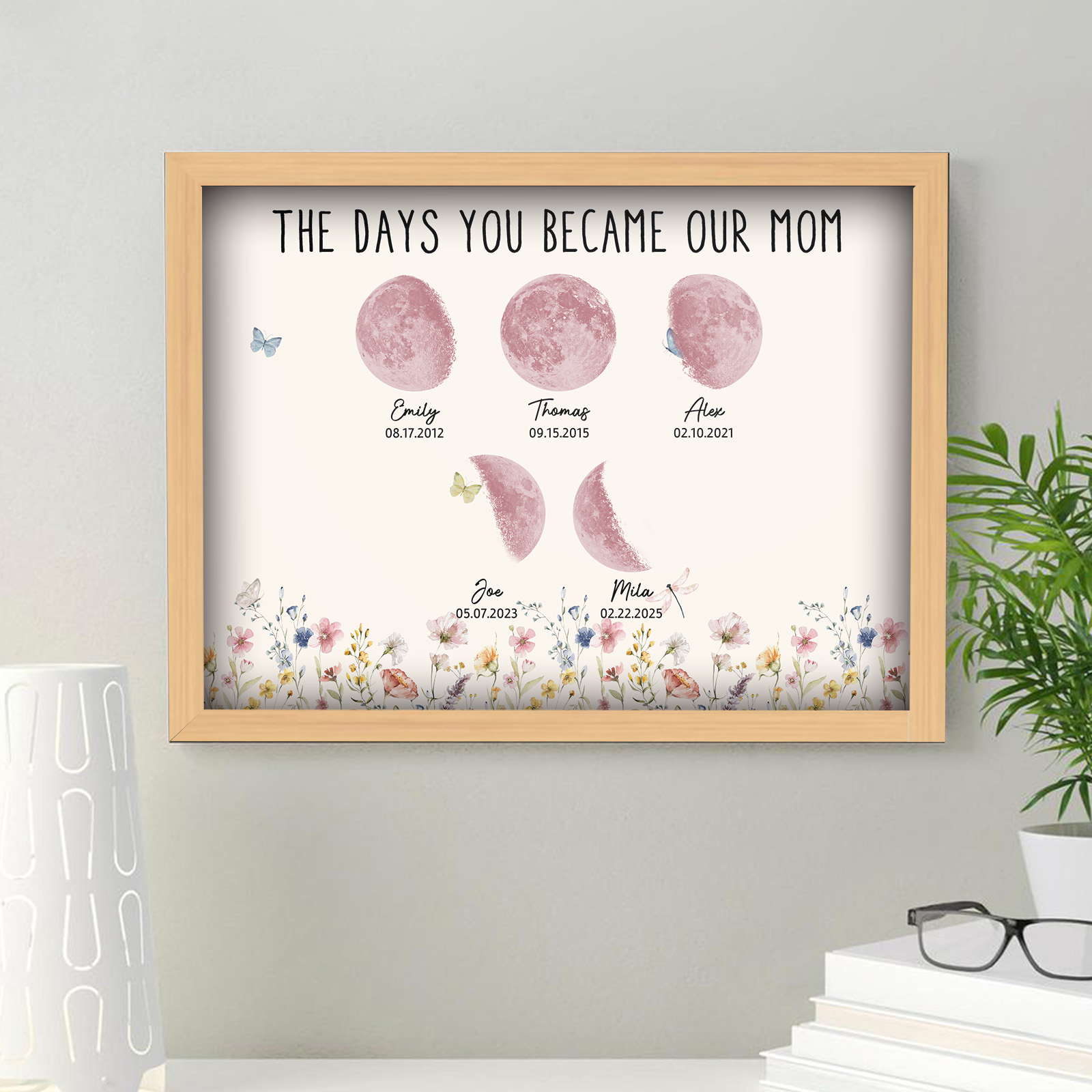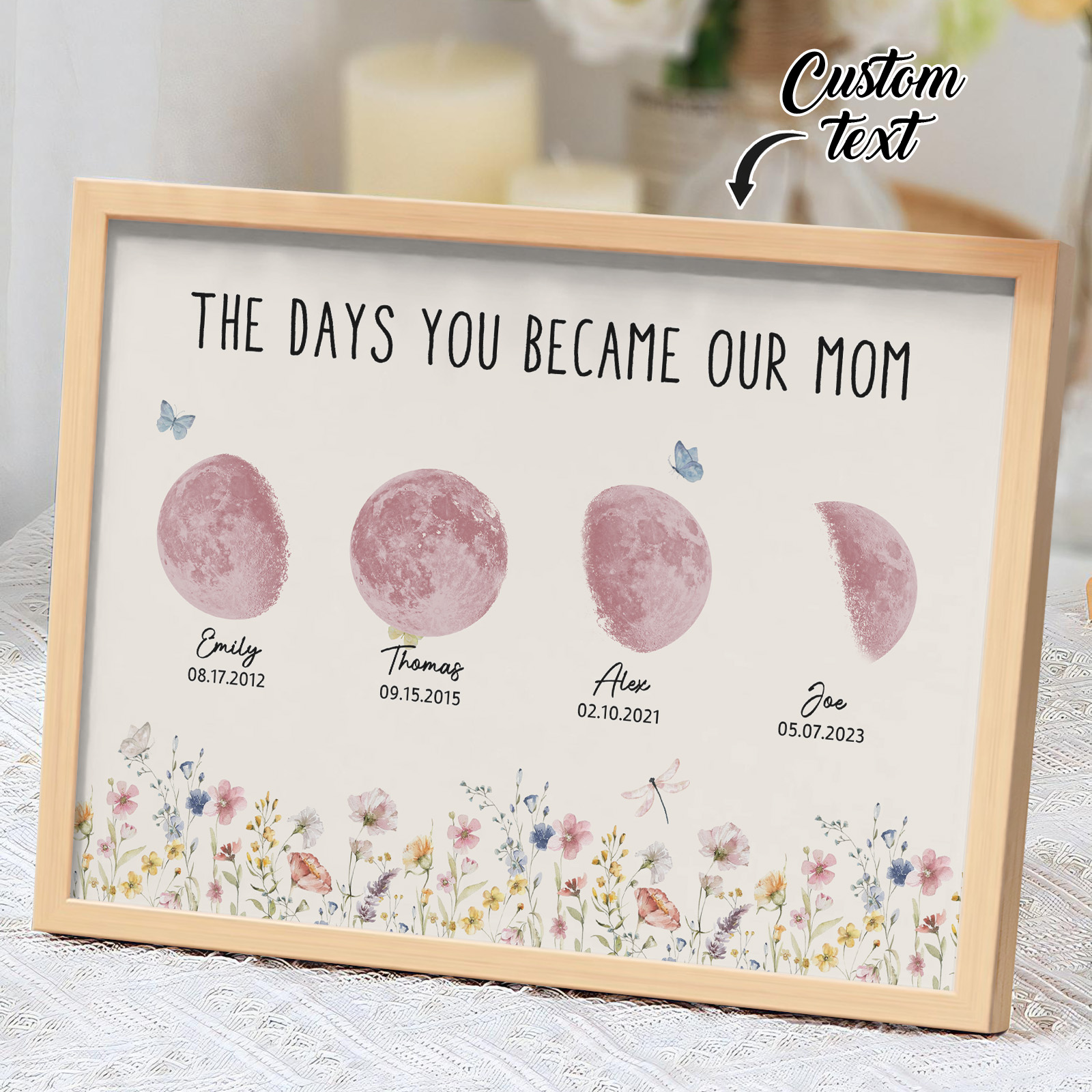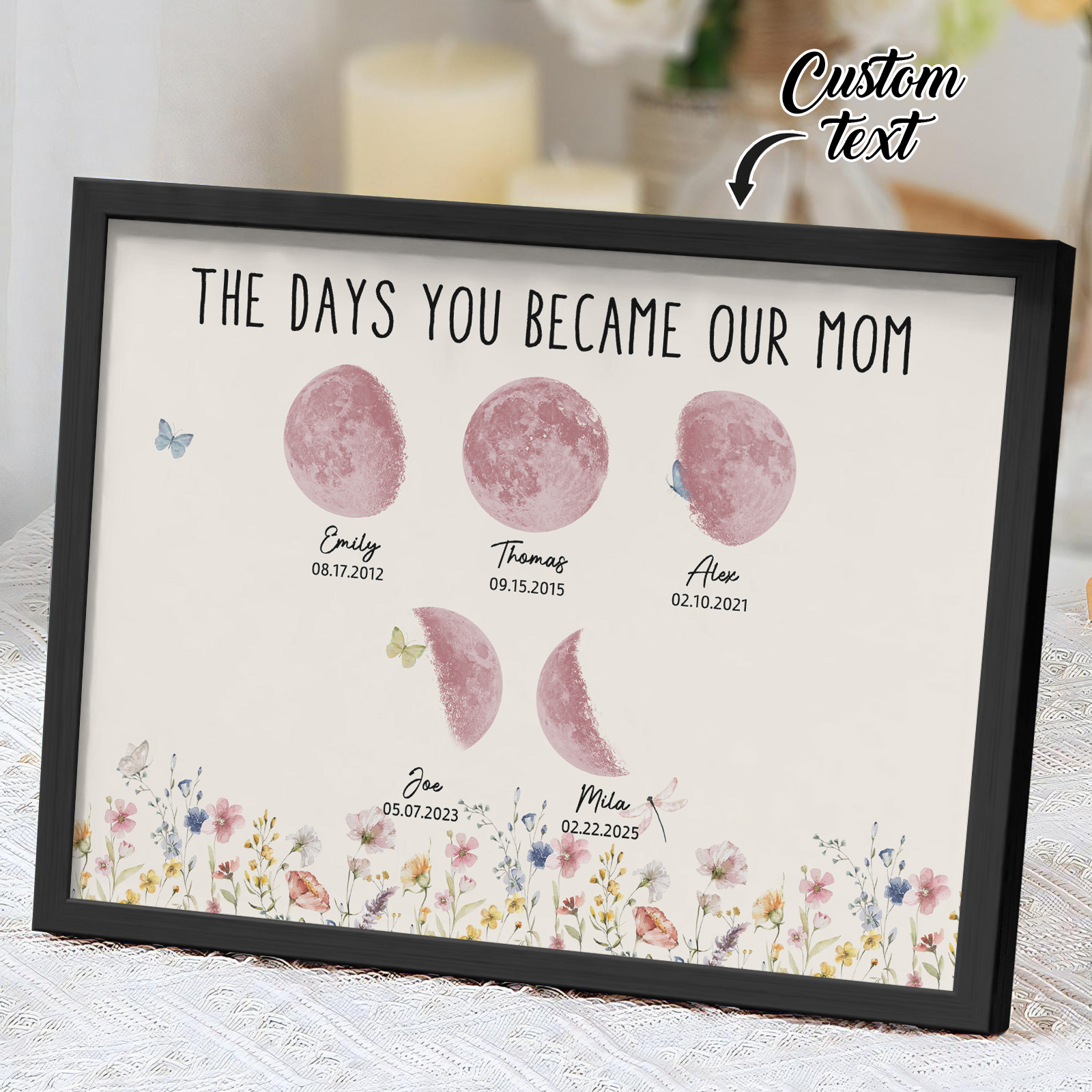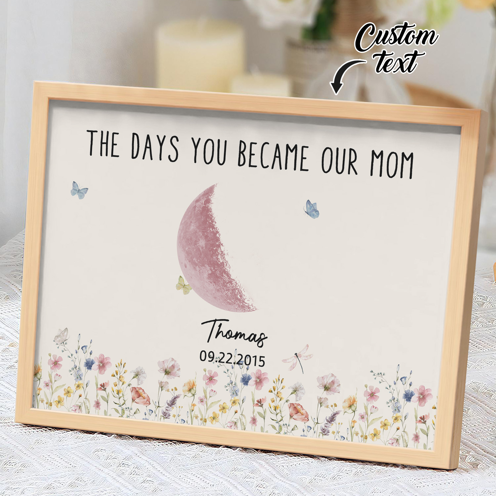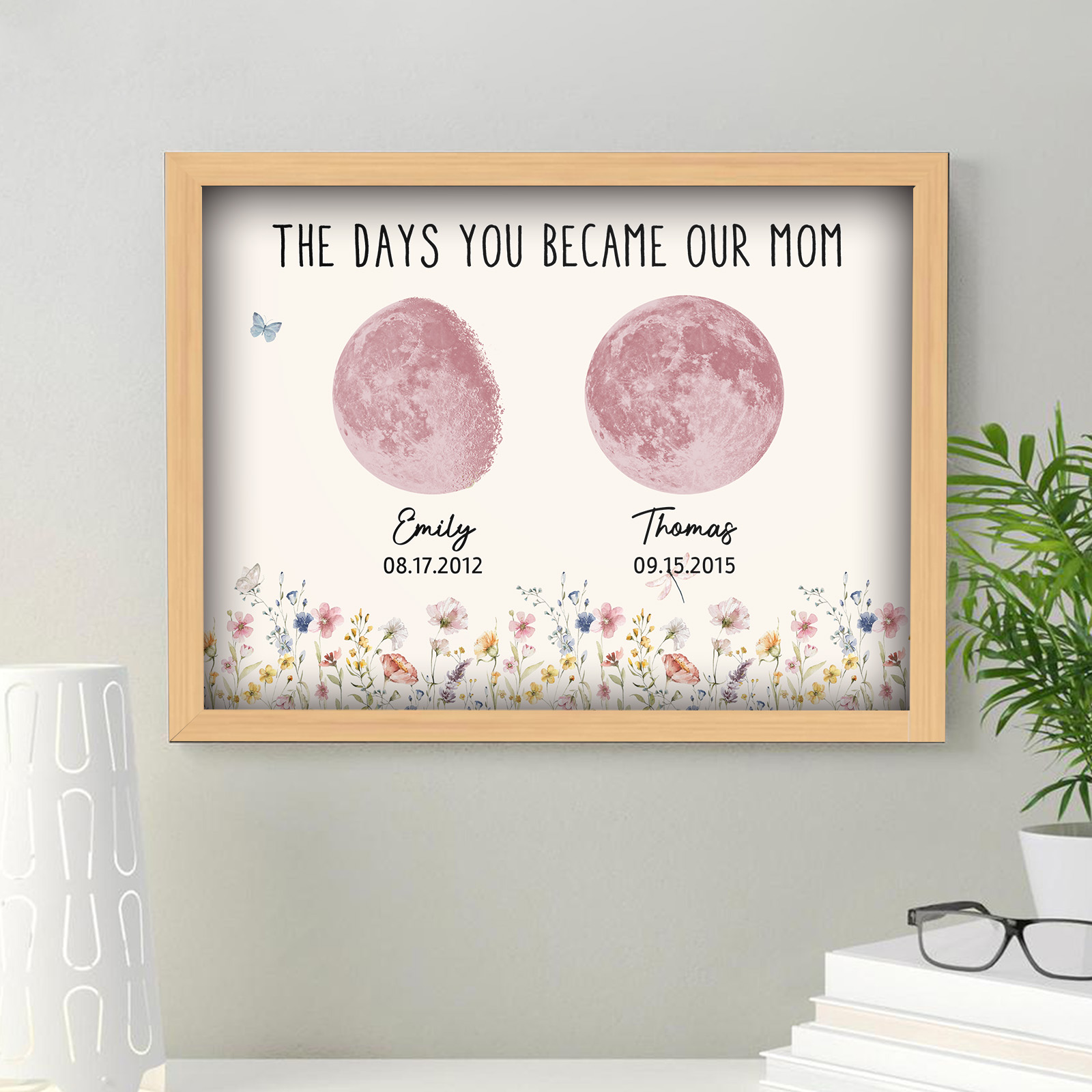El nombre, la fecha de nacimiento y la fase lunar única de cada niño se muestran de forma hermosa, creando un recuerdo celestial único que honra los momentos especiales que la convirtieron en madre.