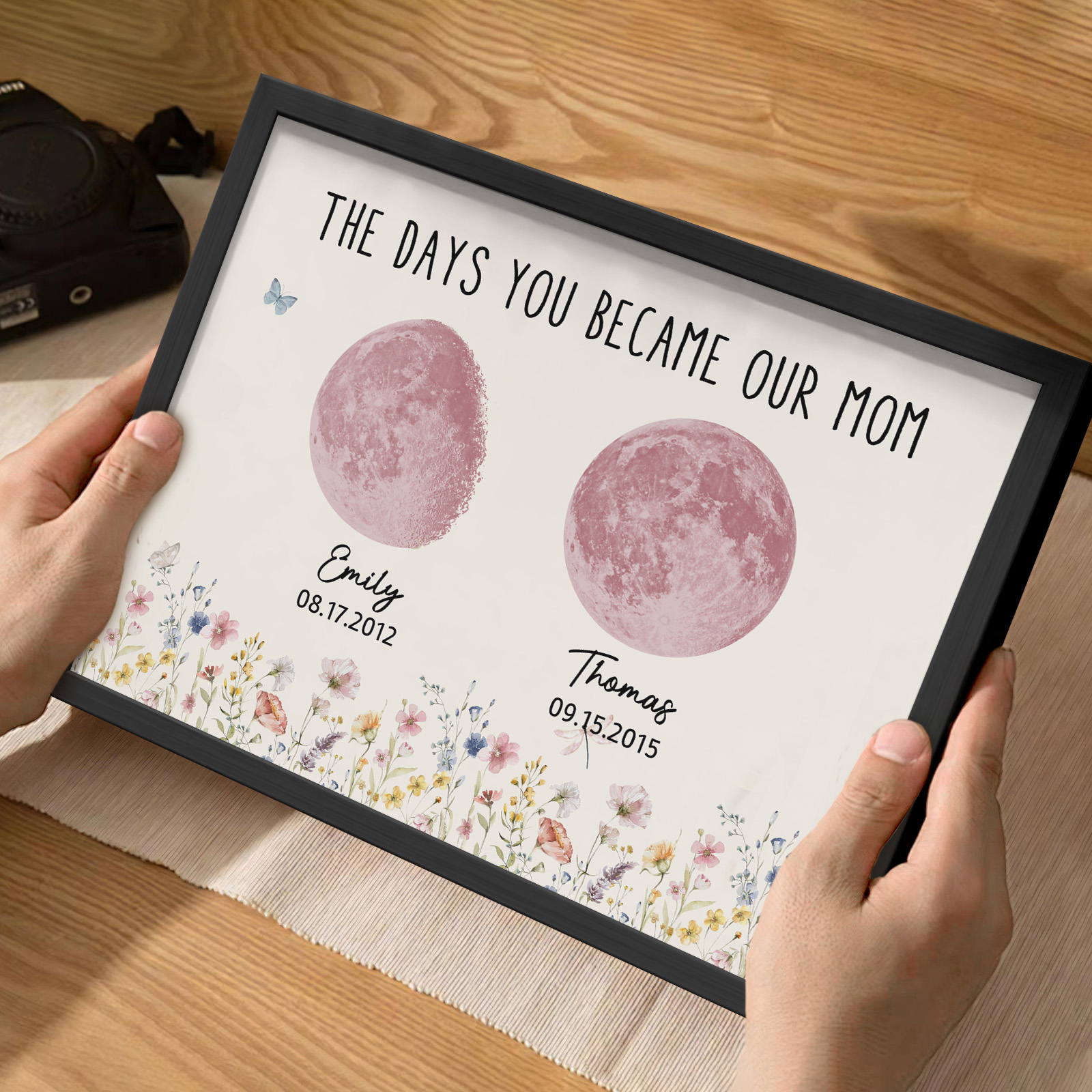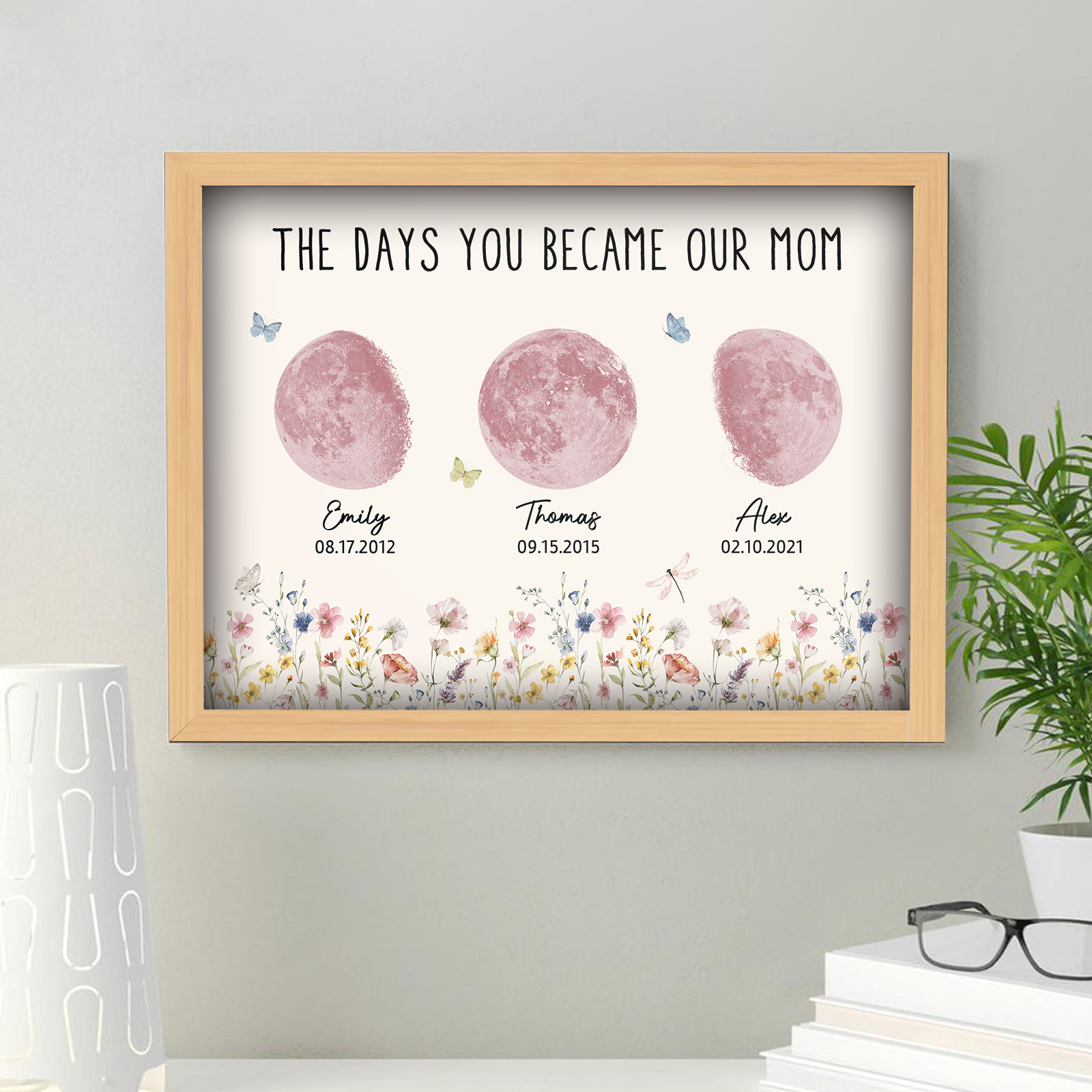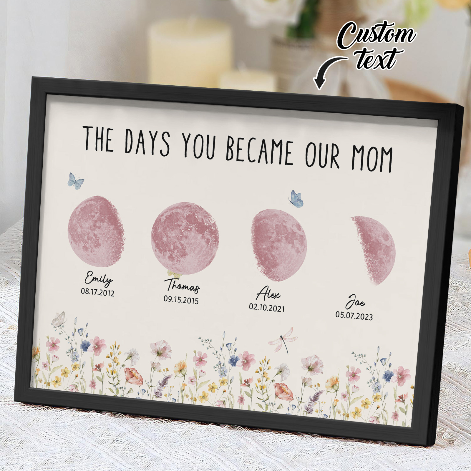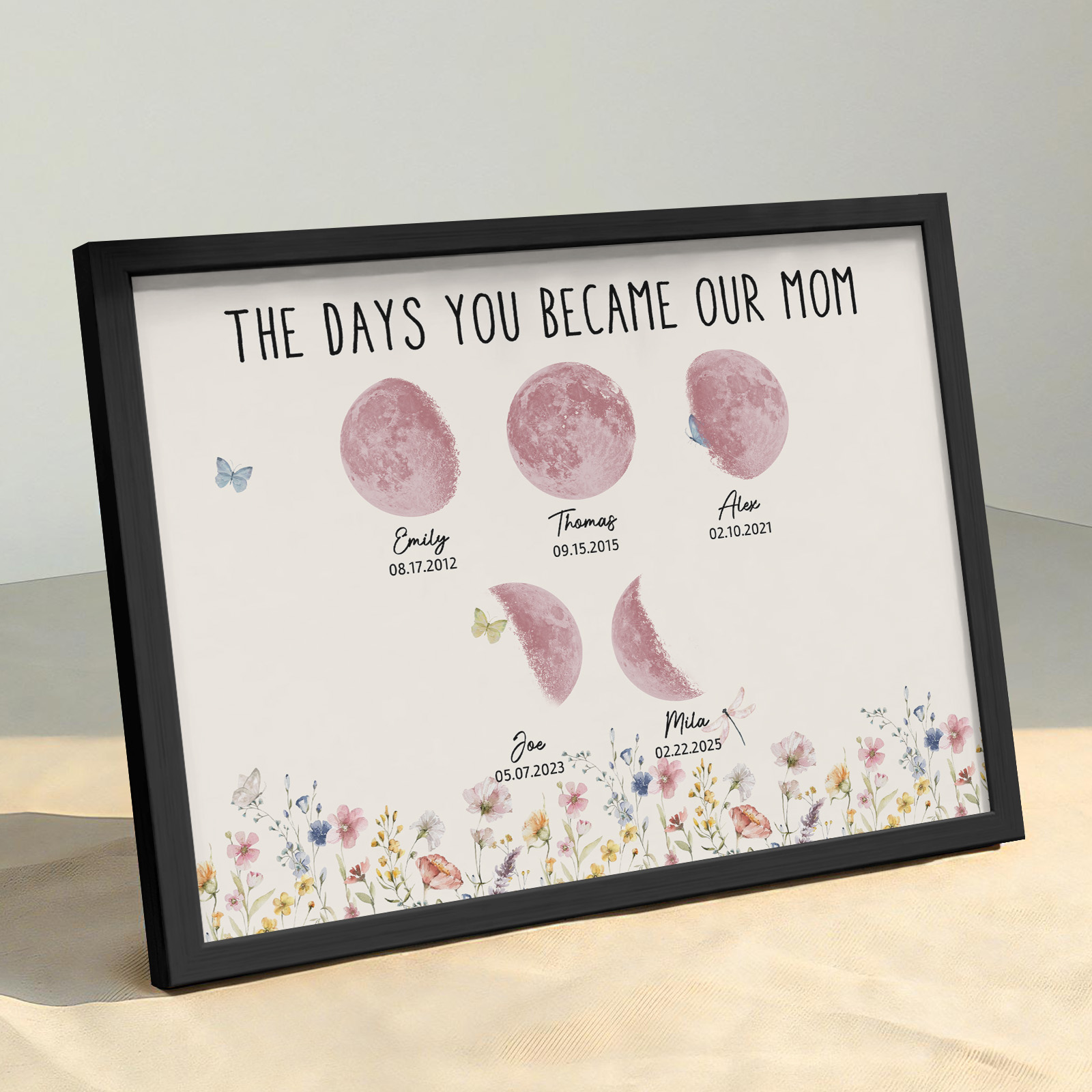 El nombre, la fecha de nacimiento y la fase lunar única de cada niño se muestran de forma hermosa, creando un recuerdo celestial único que honra los momentos especiales que la convirtieron en madre.