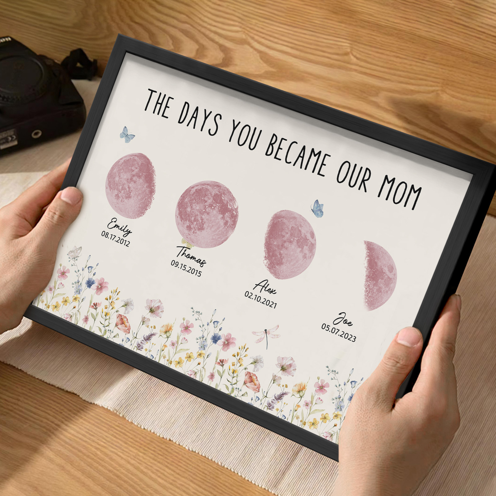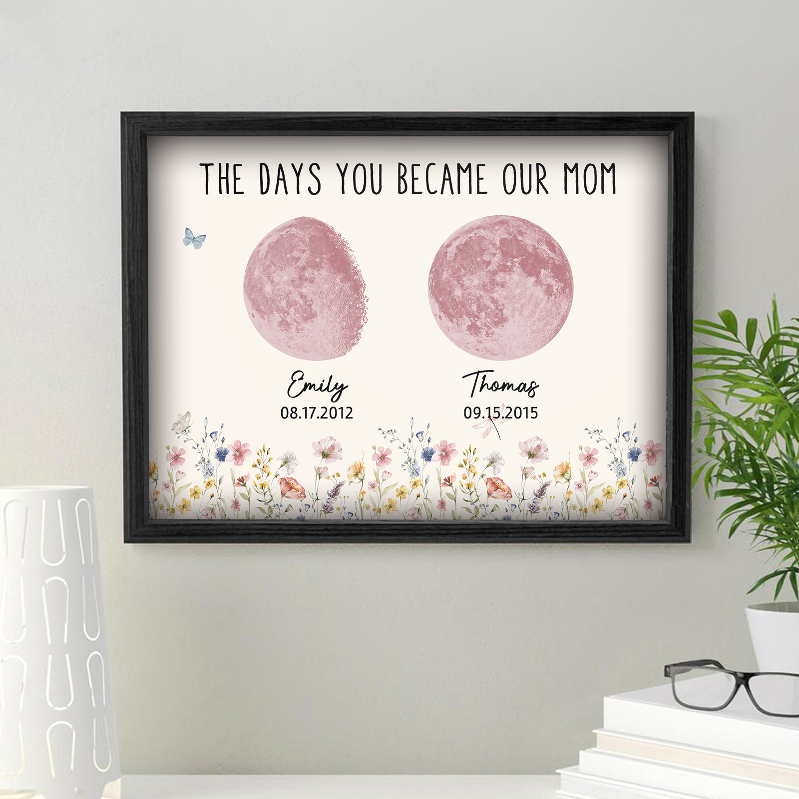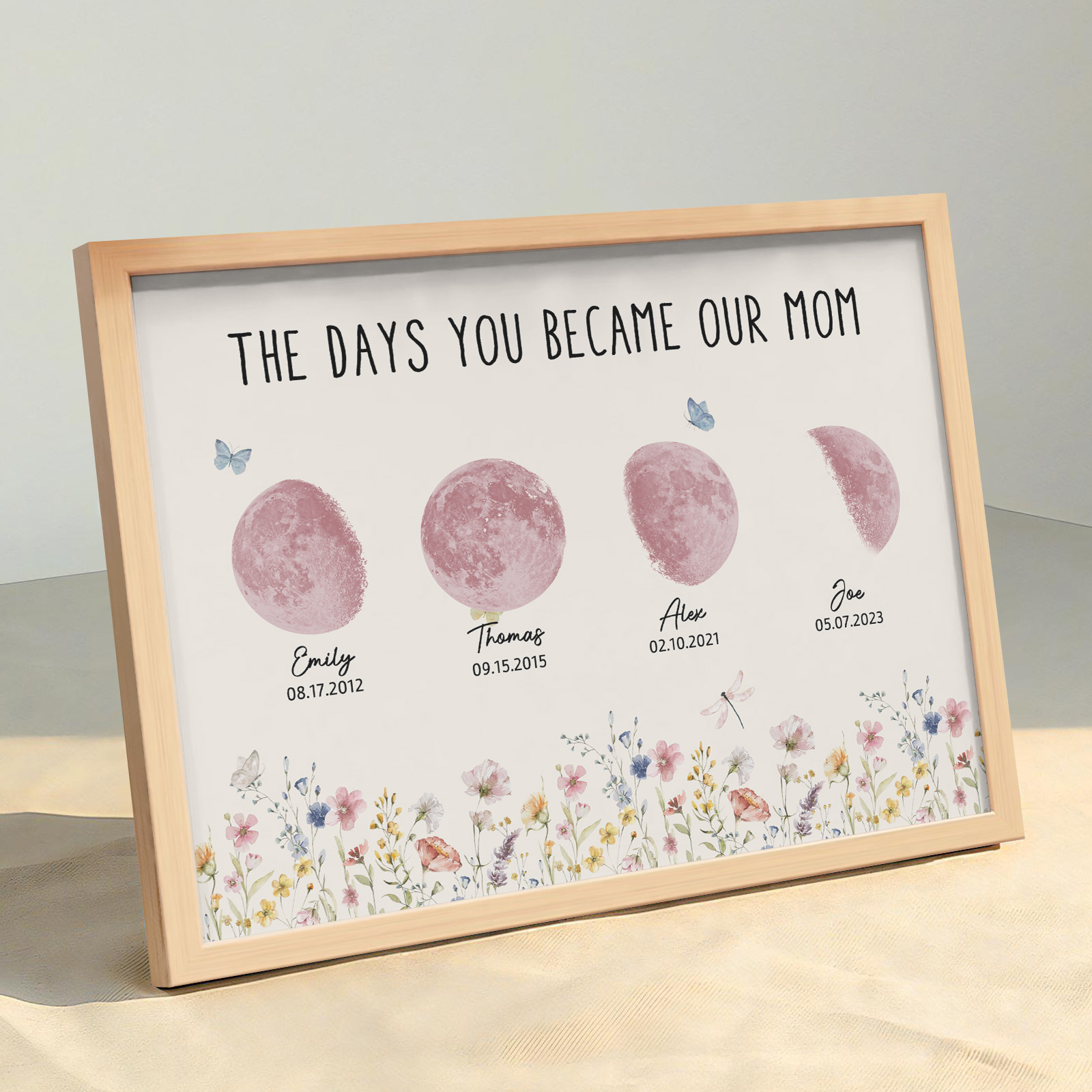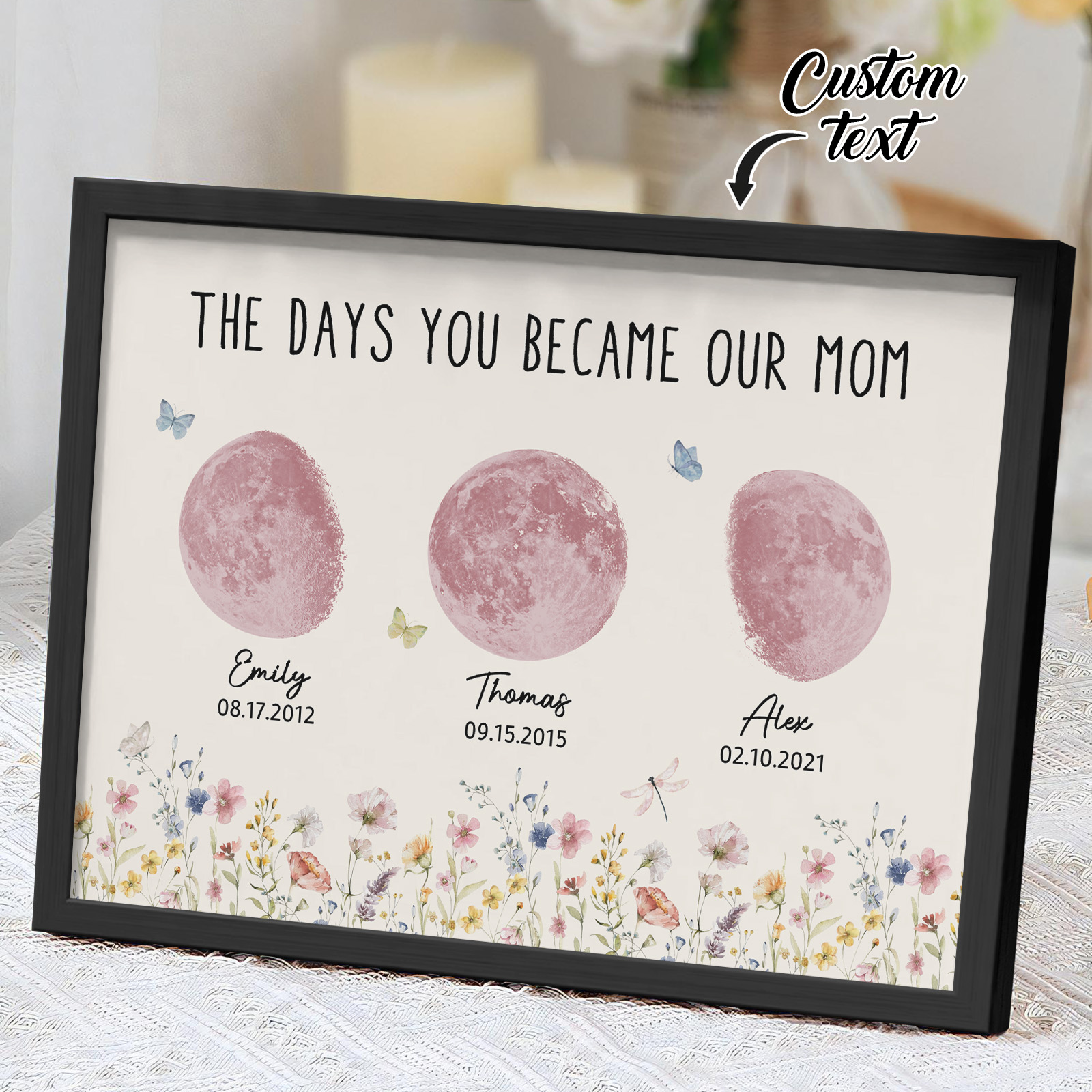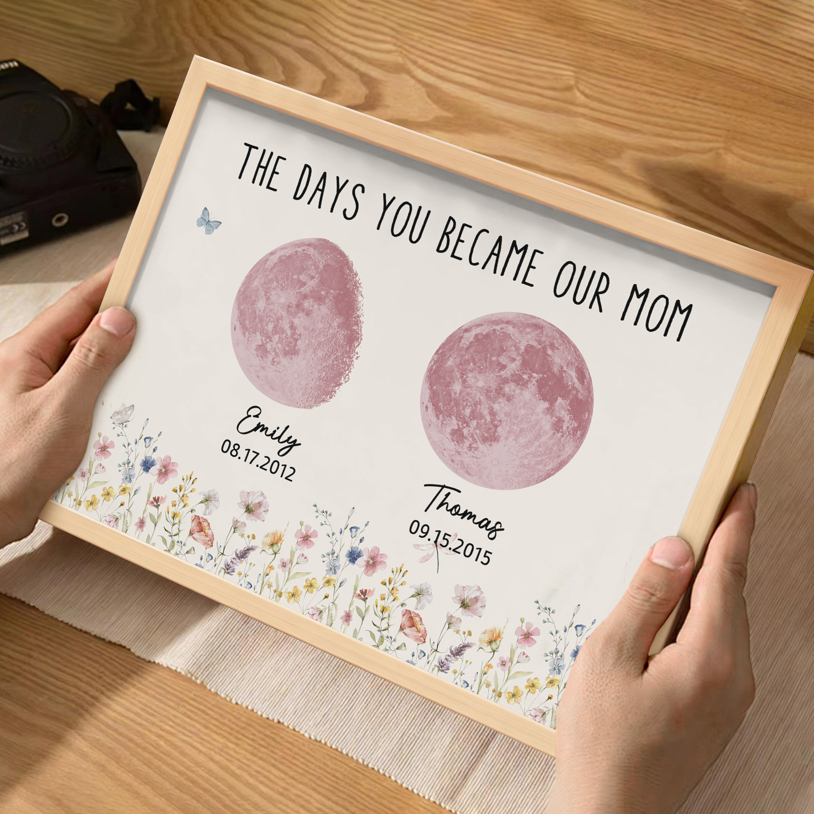 El nombre, la fecha de nacimiento y la fase lunar única de cada niño se muestran de forma hermosa, creando un recuerdo celestial único que honra los momentos especiales que la convirtieron en madre.