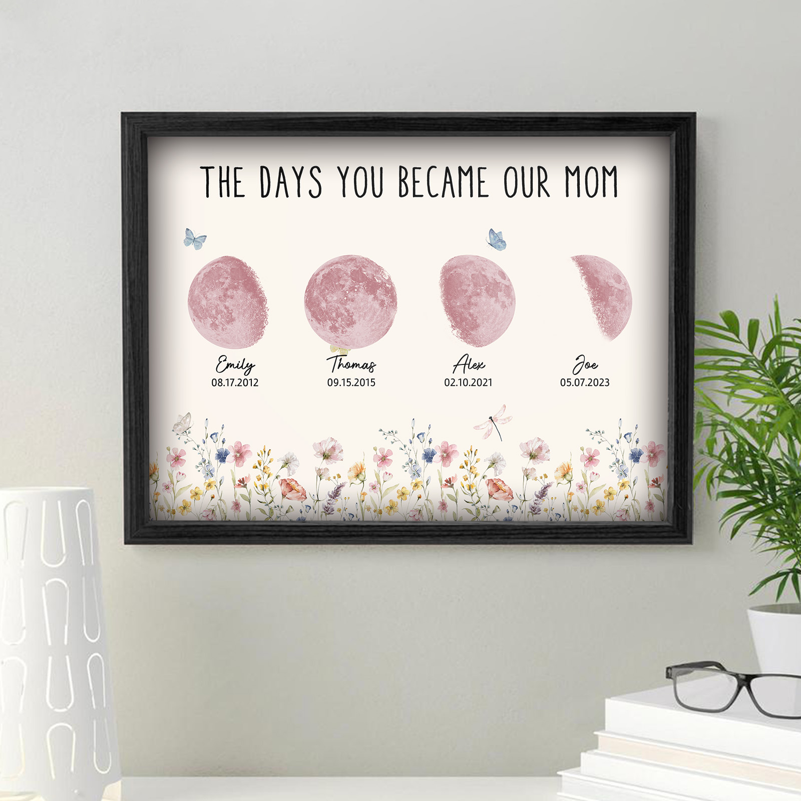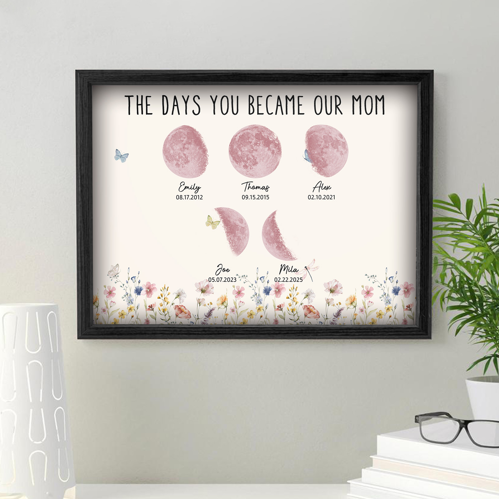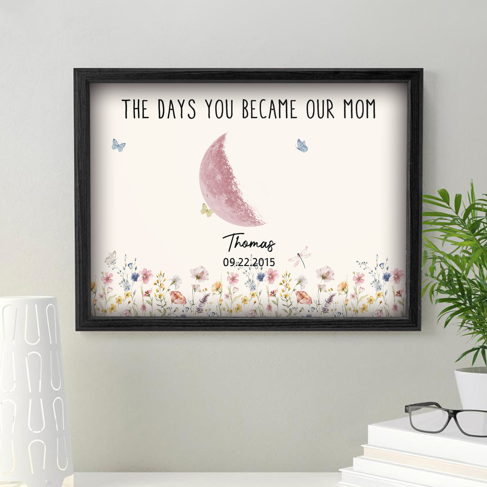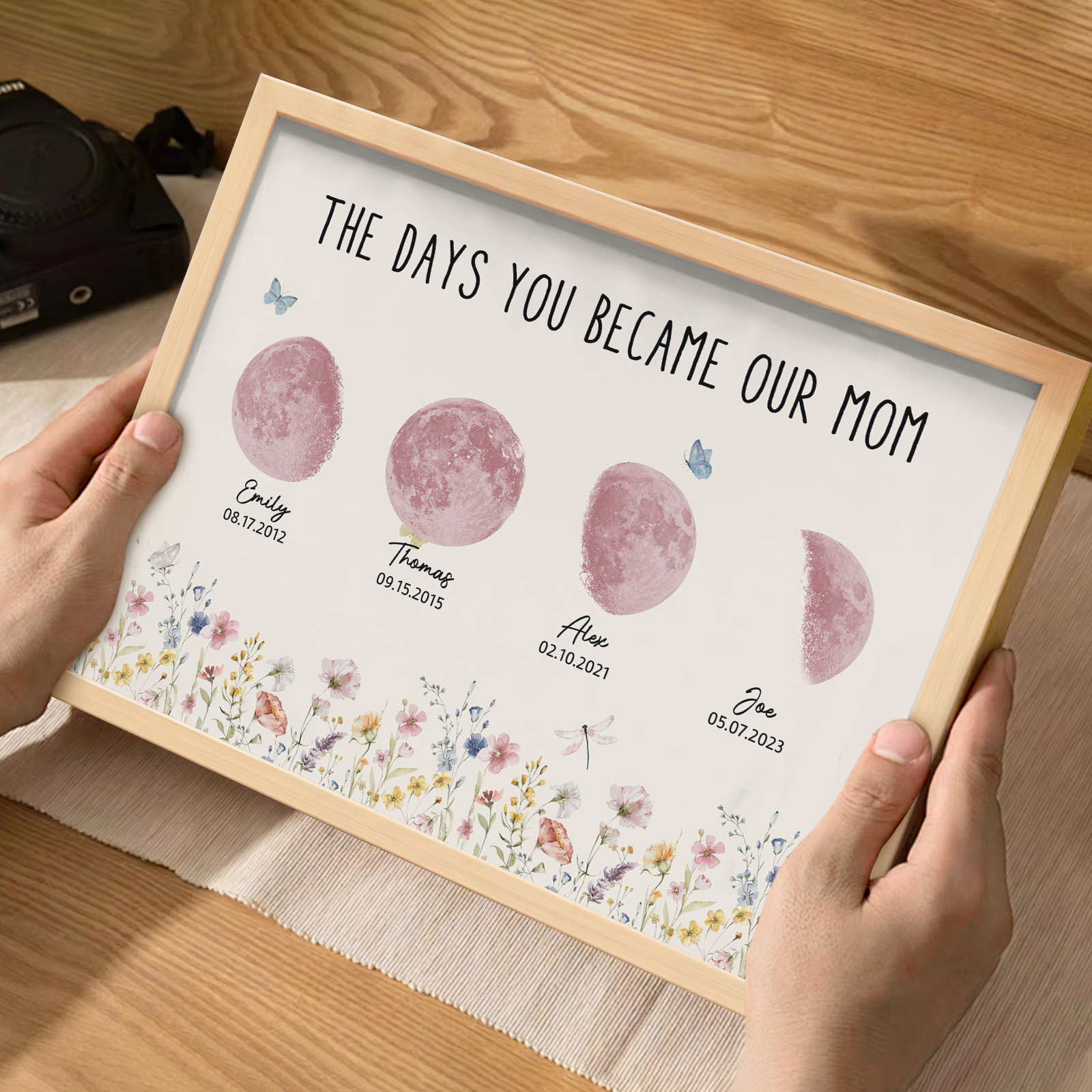 El nombre, la fecha de nacimiento y la fase lunar única de cada niño se muestran de forma hermosa, creando un recuerdo celestial único que honra los momentos especiales que la convirtieron en madre.