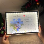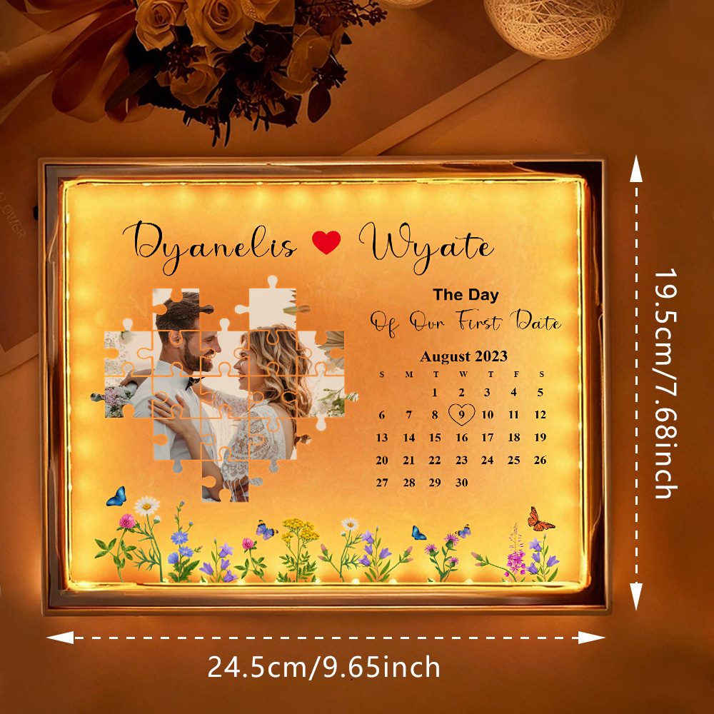 ? Cuando la luz está encendida, tu foto personalizada, fecha especial y nombres aparecen bellamente en el diseño del calendario de rompecabezas, revelando 'El día que encontré mi pieza faltante'.